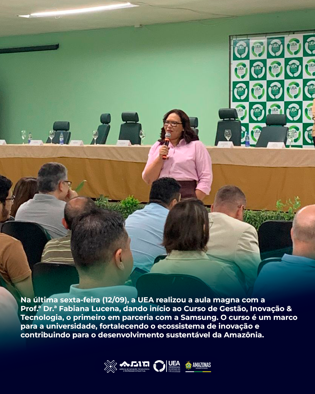 Na última sexta-feira (12/09), o auditório da Universidade do Estado do Amazonas (UEA) recebeu a aula magna ministrada pela Prof.ª Dr.ª Fabiana Lucena, marcando o início do 1º Curso de Gestão, Inovação & Tecnologia, o primeiro realizado em parceria com a Samsung.