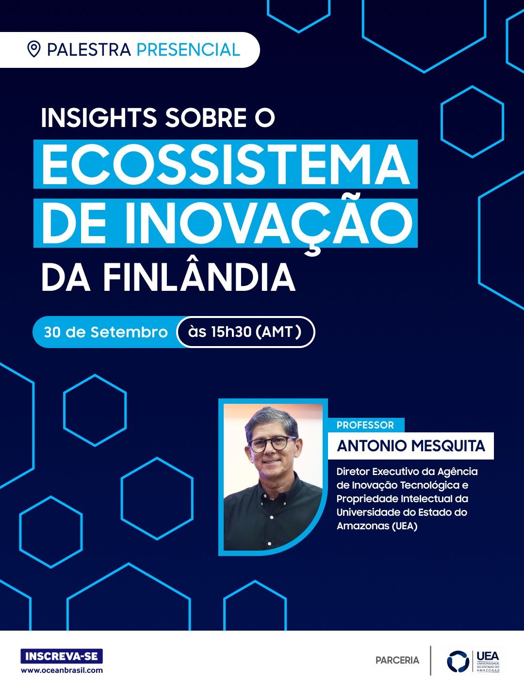 🌍✨ O Ocean Manaus convida você para a palestra “Insights sobre o Ecossistema de Inovação da Finlândia”, com o professor Antonio Mesquita — biólogo, doutor em Engenharia de Recursos Naturais, professor titular da UEA e diretor da Agência de Inovação.